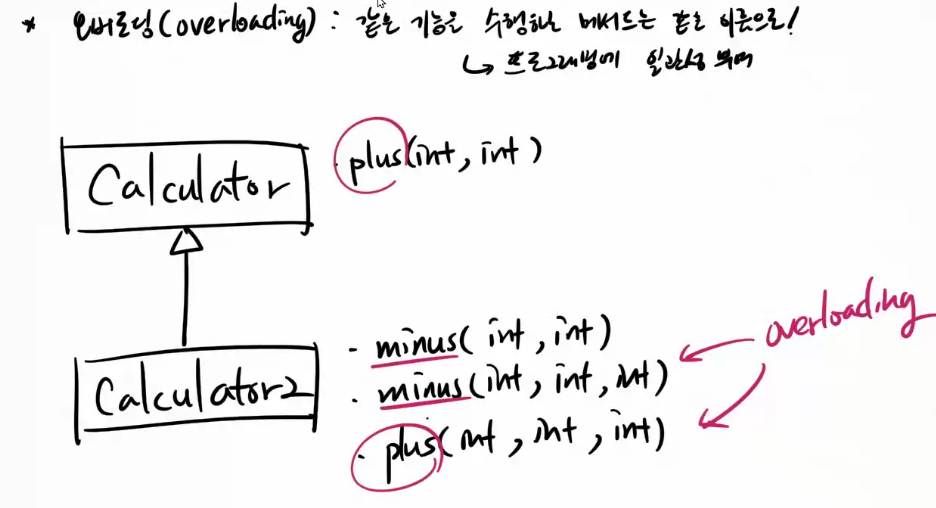 오버로딩: (파라미터 갯수 등 타입이 다르더라도) 같은 기능을 수행하는 메서드에 대해 같은 이름을 부여함으로써 일관성있게 프로그래밍가능하게 하는 문법