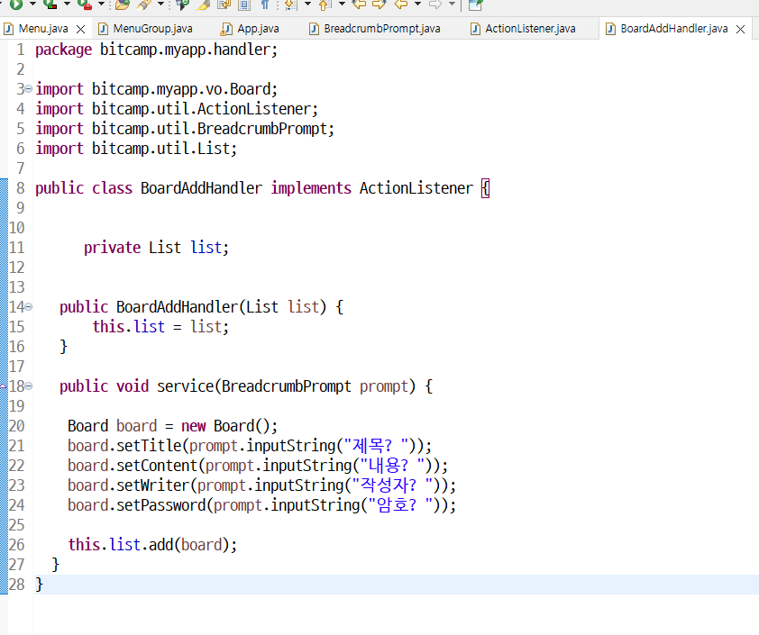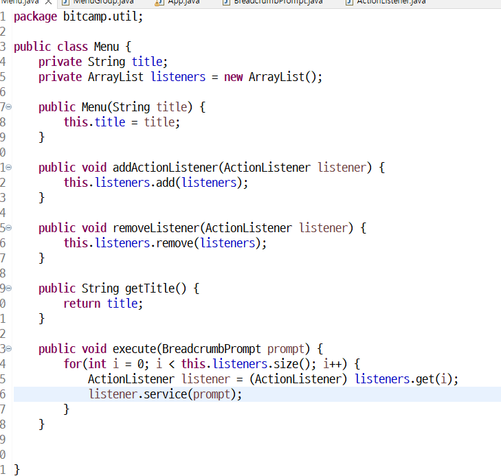 ArrayList menus ; //ArrayList menus = new ArrayList(); 초기화 수행문은 밑으로 내려감