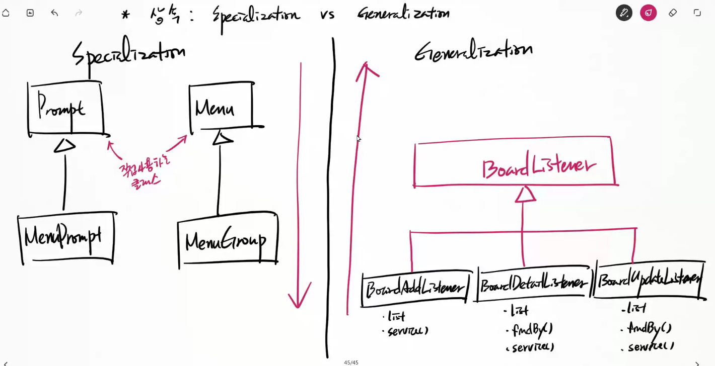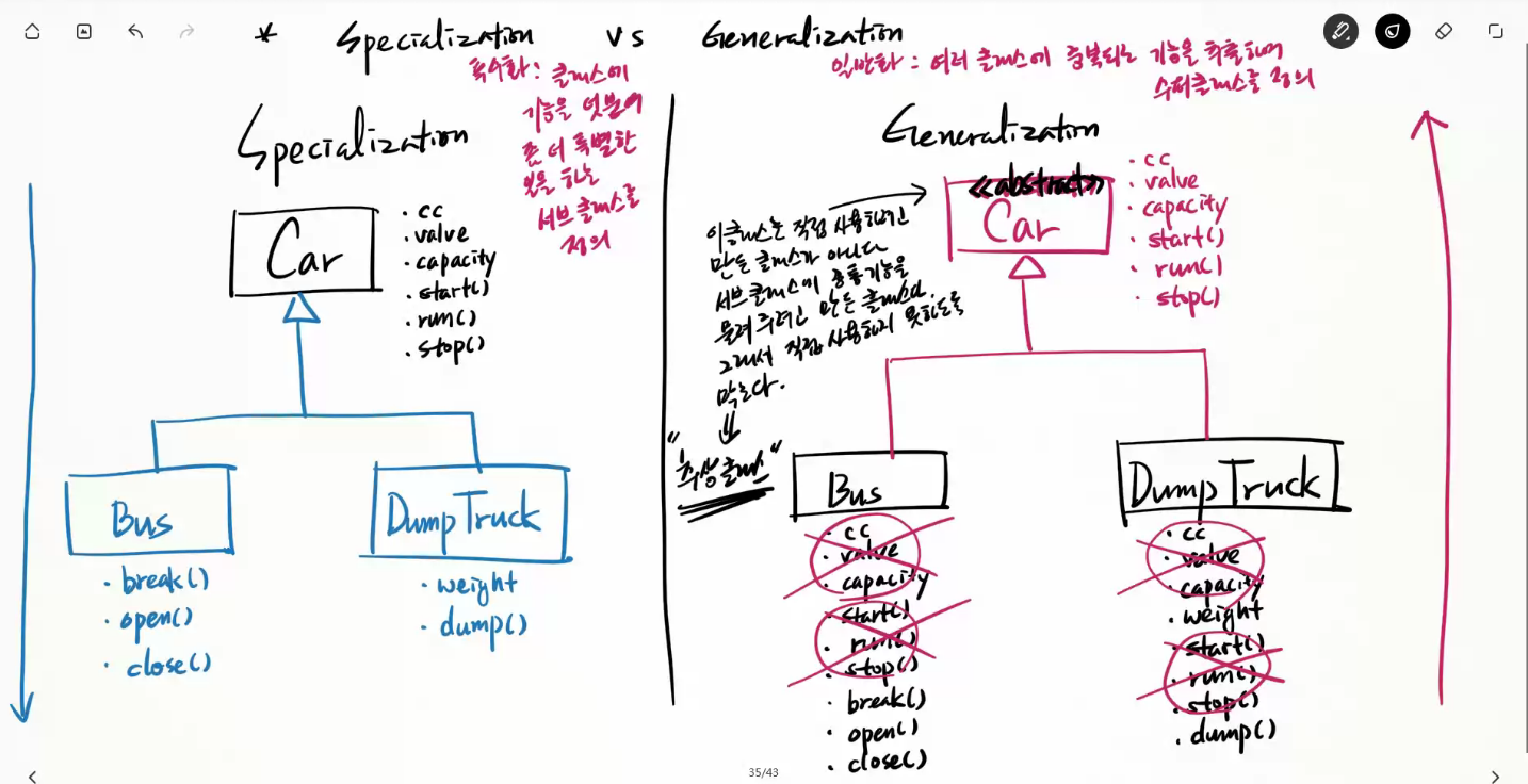 특수화 : 스페셜: 위에서 아래로 확장하는거 // 특별한 카 (보편적인 상속)/ 클래스의 기능을 덧붙여 좀 더 특별한 일을 하는 서브클래스를 정의