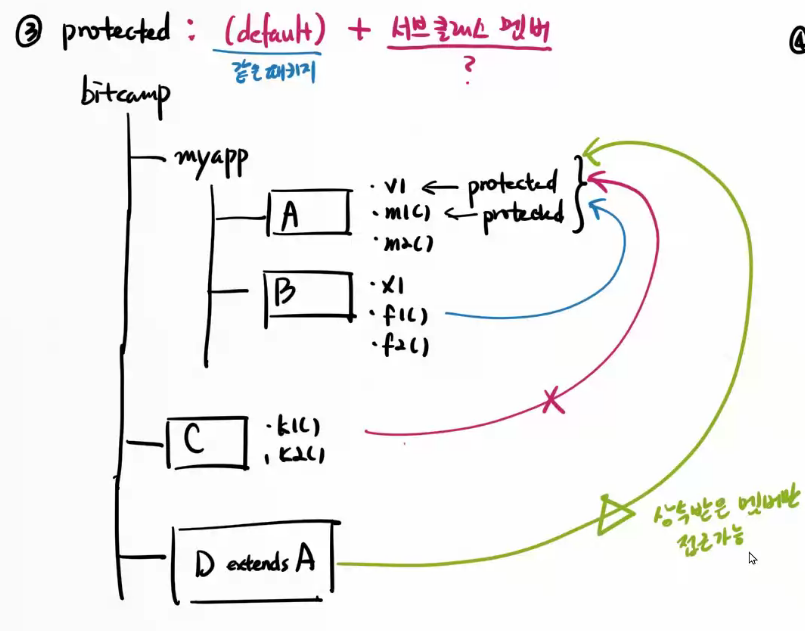 - protected : (default) + 서브클래스 멤버 // 같은 패키지 접근 가능, 다른패키지는 안 됨.