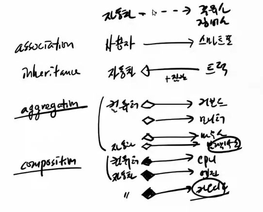 association연관(단순 사용), inherrigance상속, aggregation 집합(포함), compostion(음,, 거의 일체형같은,,자동차->엔진)