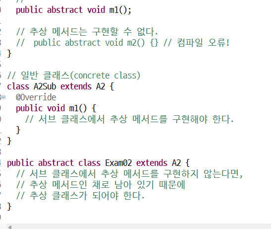 // 그러므로 A3를 상속 받은 일반 클래스는 반드시 m1() 메서드를 구현했다는 의미다.