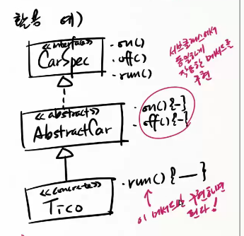 - 모든 메서드는 기본이 public이구 abstract다. 따라서 메서드 선언에 생략해도 된다.