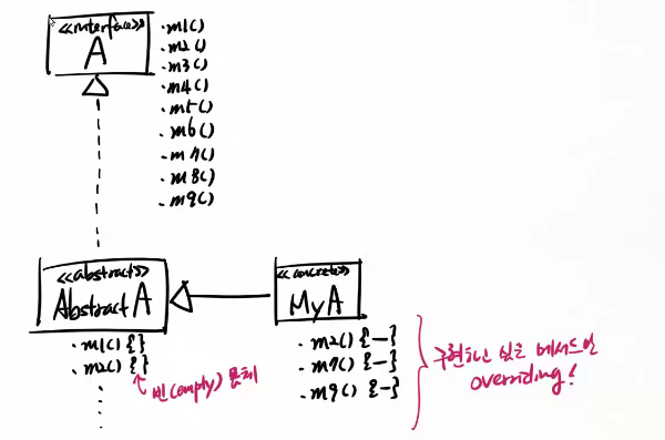 추상클래스의 역할 : 인터페이스를 구현하기 쉽도록 미리 메서드를 간단하게 overriding