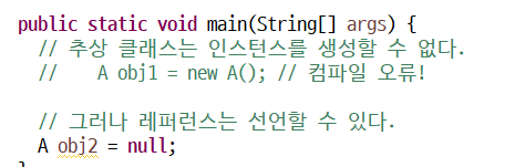 추상클래스는 인스턴스를 생성할 수 없다. 레퍼런스는 생성할 수 있다.