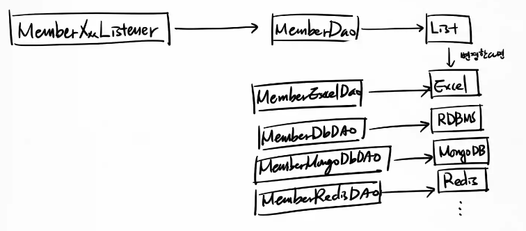 Excel or Database or MongoDB or Redis 등등으로 저장소 변경을 하게 되면 MemberListListener의 데이터 조작 방식이 바뀌기 때문에 모든 Listener 클래스를 변경해야한다.