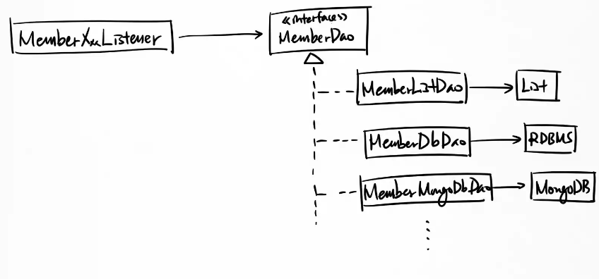 Listener와 DAO를 인터페이스로 연결하면 DAO 클래스를 교체하더라도 Listener클래스를 변경할 필요가 없다.