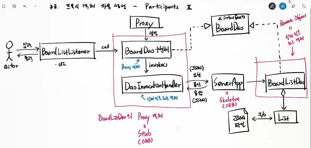 | [용어] BoardListDao 랑 BoardNetworkDao는 <<interface>>BoardDao를 구현함 BoardListDao : RemoteObject : 실제일을 하는 객체 BoardNetworkDao:클라이언트 쪽 ORB(Object Request Broker) :프록시 객체 // ==> Stub ServerApp: 서버쪽 ORB(Object Request Broker)==> Skeleton BoardNetworkDao와 ServerApp 는 서로 통신함 |