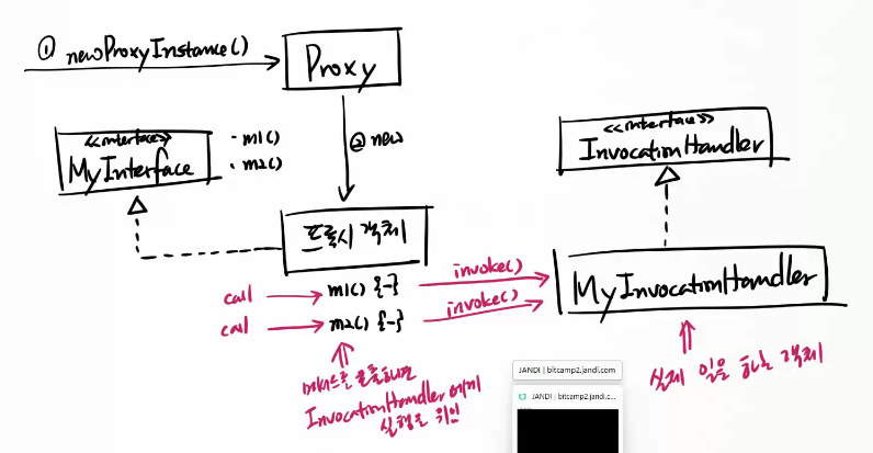 | 3. call 하면 m1{}이 invoke()하고, m2{}가 invoke()함 : invoke() 한다는 것은 MyInvocationHandler 호출(직접 일을 하는 객체) => 메서드 호출하면 InvokationHandler에게 실행을 위임 |