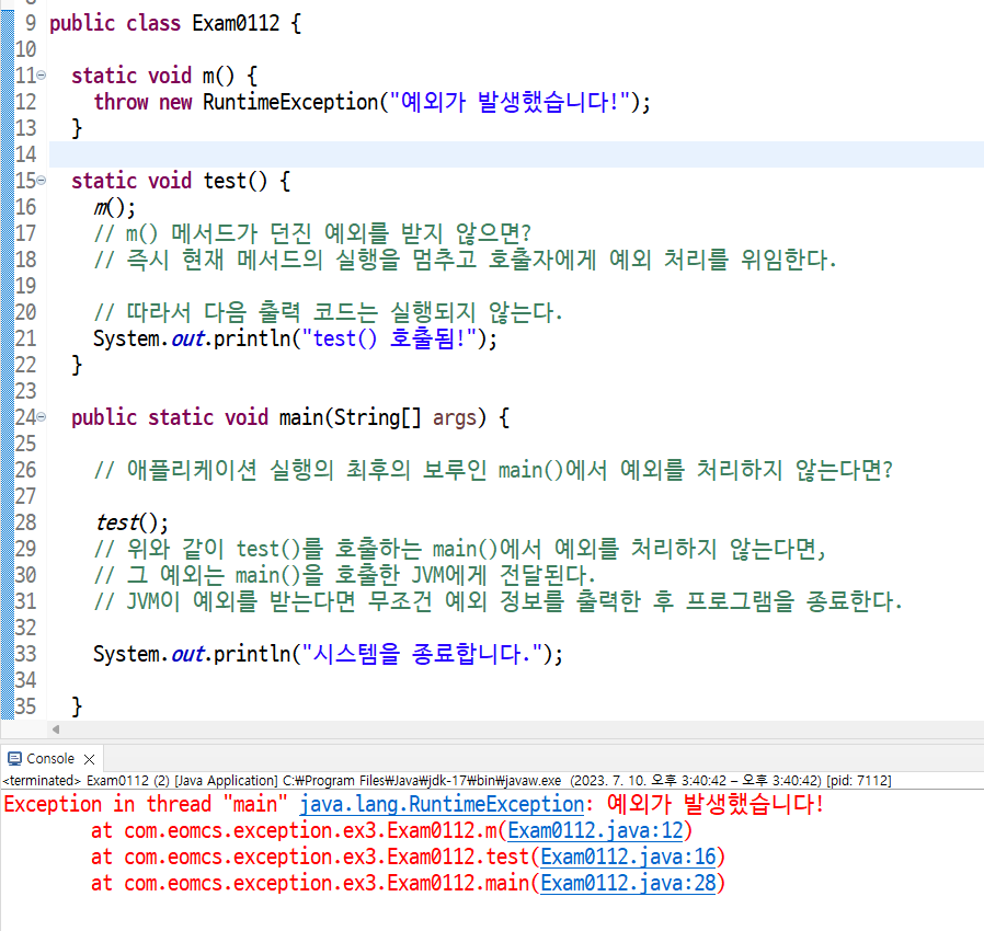 main()에서 처리하지 않은 Error 예외는 main()의 호출자(JVM)에게 전달한다.