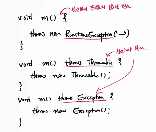 => 이때 메서드 선언부에 Throwable 예외를 던지는 메서드임을 표시해야 한다.