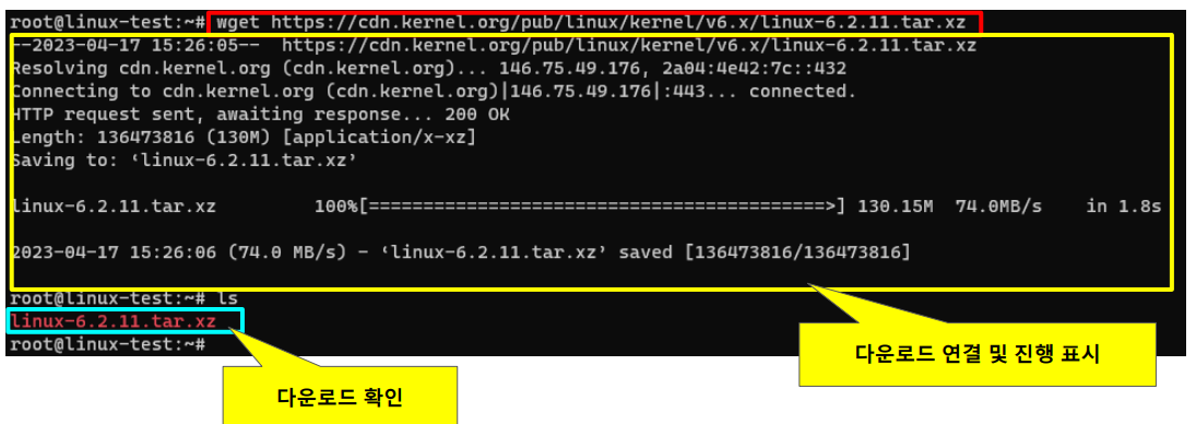 | wget 기능: 주어진 URL에서 파일을 다운로드하여 저장 형식: wget[옵션][URL] *리눅스 커널 v6.2.11 소스 코드 다운로드 : wget https://cdn.kernel.org/pub/linux/kernel/v6.x/linux-6.2.11.tar.xz |