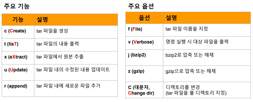 기능: (여러) 파일과 디렉토리를 하나의 파일로 묶어 아카이브(tar 파일)를 생성