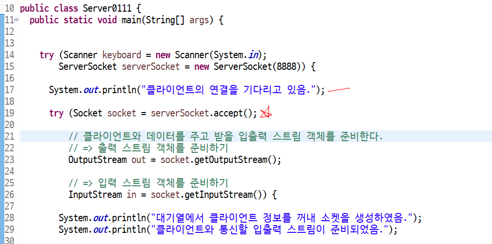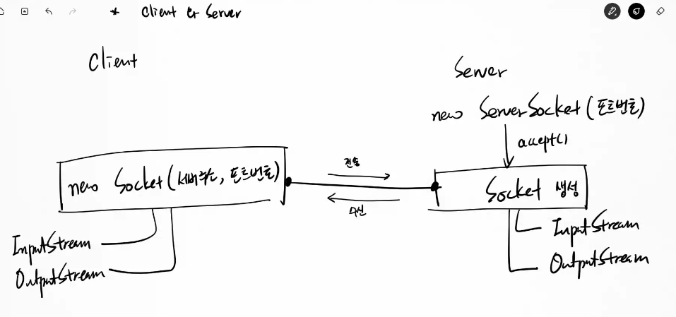 // - 연결된 클라이언트로 데이터를 보내고 받으려면 입출력 스트림을 꺼내야 한다.