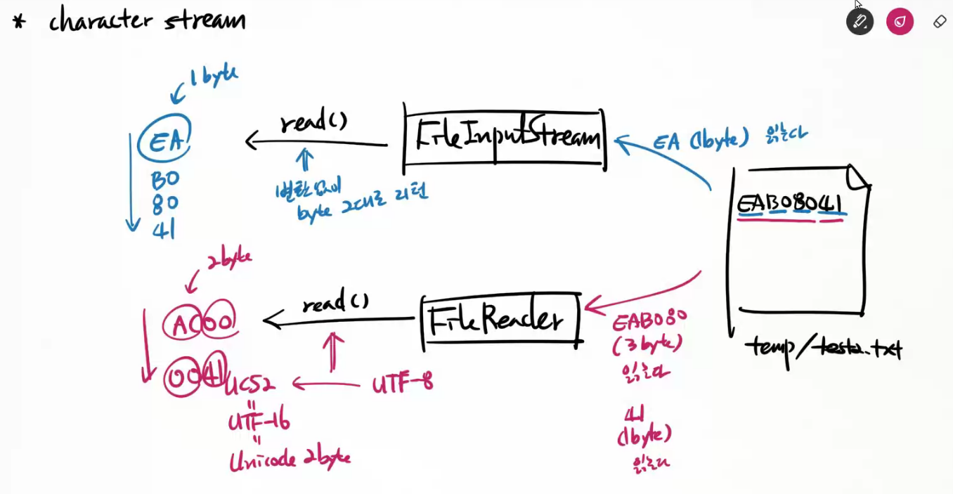 // => 파일을 읽을 때 JVM 환경 변수 'file.encoding'에 설정된 문자코드표에 따라 바이트를 읽는다.