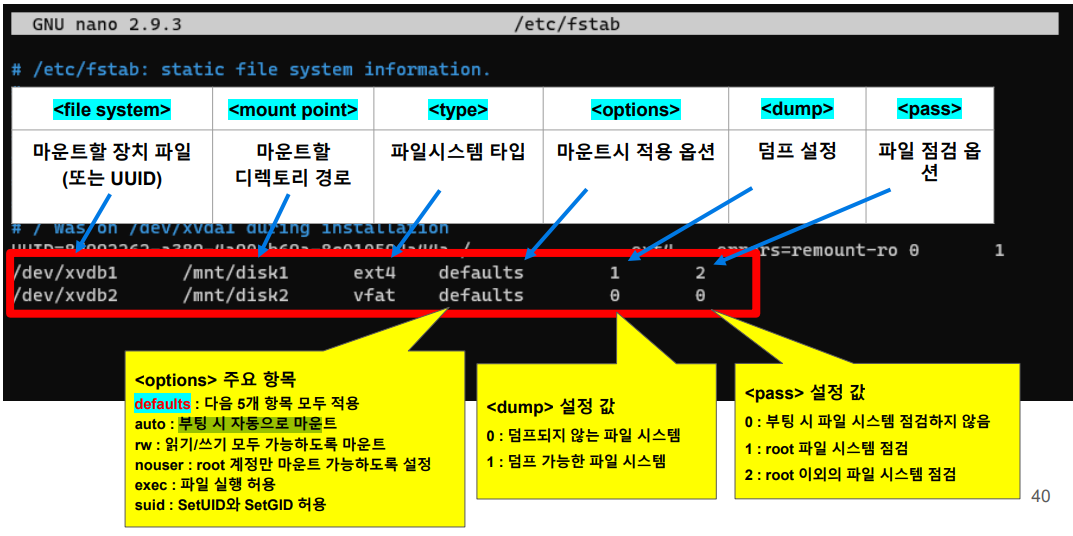 1. 나노 편집기로 /etc/fstab 오픈 후 /dev/xvdb1, /dev/xcdb2 설정 내용 통으로 삭제 후 저장