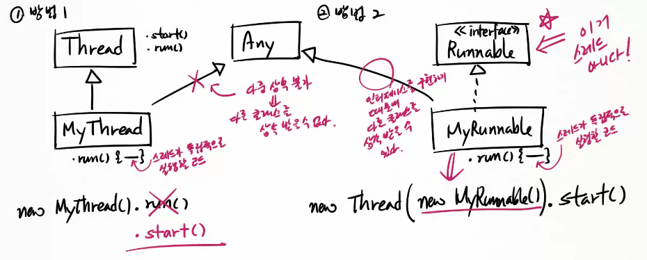 main() 중간에 new Thread().start()면 Thread 가 run()을 call 함. (call 하는 순간 새 실행흐름이 생성 및 실행됨