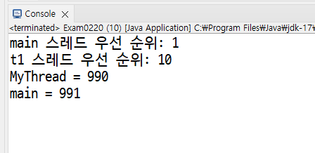 System.out.printf("%s 스레드 우선 순위: %d\n", t1.getName(), t1.getPriority());