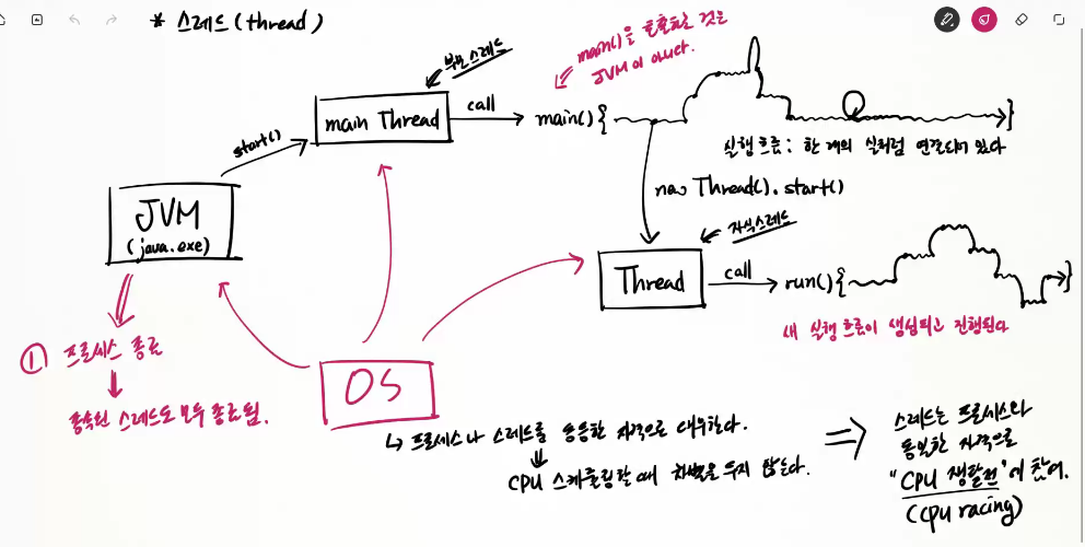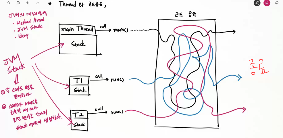 JVM (start() ) -> main Thread -> call main() : 실행흐름: 한 개의 실처럼 연결되어 있다. 절대 중간에 끊기지않음
