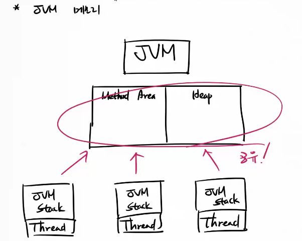 JVM STACK은 thread 마다 존재, method area랑 heap은 공유 !