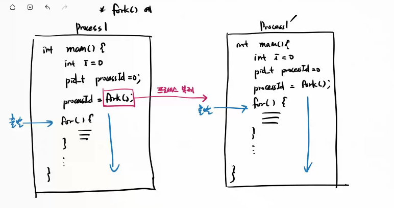 processId = fork(); // 현재 실행 실행 위치에서 프로세스 복제