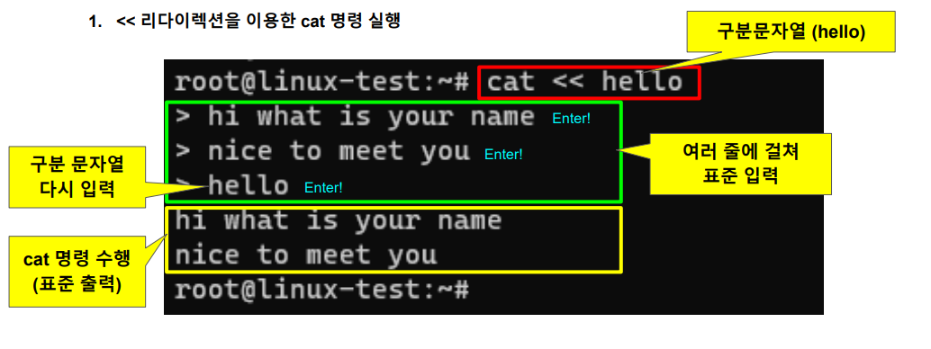 2. 명령 << 구분 문자열: << 뒤에 지정한 구분문자열이 다시 입력될때까지 표준 입력을 수행, 이후 구분 문자열 이전까지의 내용에 대해 명령 수행