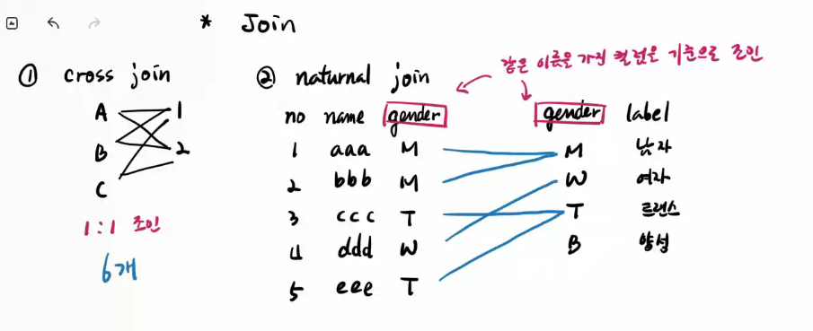 | /* 조인 => 서로 관련된 테이블의 데이터를 연결하여 추출하는 방법 => 기법 1) CROSS 조인(=Cartesian product) 2) NATURAL 조인 3) JOIN ~ USING(컬럼명) 4) JOIN ~ ON 5) OUTER JOIN */ -- 1) CROSS 조인(=Cartesian product) - 두 테이블의 데이터를 1:1로 모두 연결한다. create table board1 ( bno int primary key auto_increment, title varchar(255) not null, content text ); create table attach_file1 ( fno int primary key auto_increment, filepath varchar(255) not null, bno int not null ); alter table attach_file1 add constraint attach_file1_fk foreign key (bno) references board1 (bno); insert into board1 values(1, '제목1', '내용'); insert into board1 values(2, '제목2', '내용'); insert into board1 values(3, '제목3', '내용'); insert into attach_file1 values(101, 'a1.gif', 1); insert into attach_file1 values(102, 'a2.gif', 1); insert into attach_file1 values(103, 'c1.gif', 3); select bno, title from board1; select fno, filepath, bno from attach_file1; -- bno 컬럼이 두 테이블에 모두 존재한다. -- 따라서 어떤 테이블의 컬럼인지 지정하지 않으면 실행 오류! select bno, title, content, fno, filepath from board1 cross join attach_file1; -- select 컬럼이 두 테이블에 모두 있을 경우, -- 컬럼명 앞에 테이블명을 명시하여 구분하라! select board1.bno, title, content, fno, filepath, attach_file1.bno from board1 cross join attach_file1; -- cross join 고전 문법 (그냥 곱하기임)*/ select board1.bno, title, content, fno, filepath, attach_file1.bno from board1, attach_file1; -- 컬럼명 앞에 테이블명을 붙이면 너무 길다. -- 테이블에 별명을 부여하고 그 별명을 사용하여 컬럼을 지정하라. select b.bno, title, content, fno, filepath, a.bno from board1 as b cross join attach_file1 as a; -- as는 생략 가능 select b.bno, title, content, fno, filepath, a.bno from board1 b cross join attach_file1 a; -- 고전 문법 select b.bno, title, content, fno, filepath, a.bno from board1 b, attach_file1 a; |