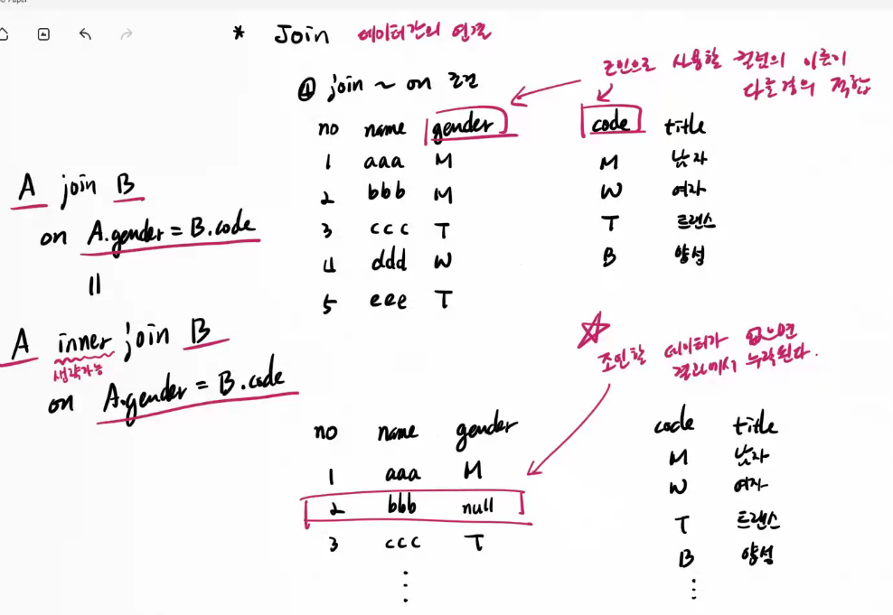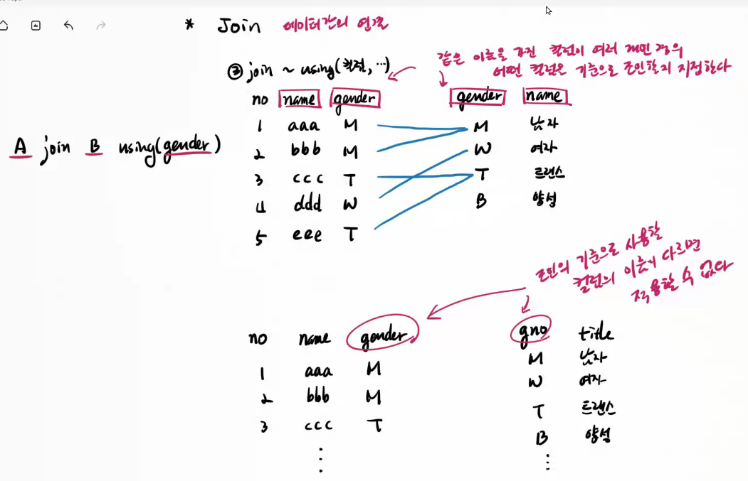 | /* 조인 => 서로 관련된 테이블의 데이터를 연결하여 추출하는 방법 => 기법 1) CROSS 조인(=Cartesian product) 2) NATURAL 조인 3) JOIN ~ USING(컬럼명) 4) JOIN ~ ON 5) OUTER JOIN */ -- 3) JOIN ~ USING -- 같은 이름을 가진 컬럼이 여러 개 있을 경우 USING을 사용하여 컬럼을 명시할 수 있다. select b.bno, b.title, content, a.fno, a.title, a.bno from board4 b join attach_file4 a using (bno); -- join ~ using 의 한계 -- => 두 테이블에 같은 이름의 컬럼이 없을 경우 연결하지 못한다. create table board5 ( no int primary key auto_increment, title varchar(255) not null, content text ); create table attach_file5 ( fno int primary key auto_increment, filepath varchar(255) not null, bno int not null ); alter table attach_file5 add constraint attach_file5_fk foreign key (bno) references board5 (no); insert into board5 values(1, '제목1', '내용'); insert into board5 values(2, '제목2', '내용'); insert into board5 values(3, '제목3', '내용'); insert into attach_file5 values(1, 'a1.gif', 1); insert into attach_file5 values(2, 'a2.gif', 1); insert into attach_file5 values(3, 'c1.gif', 3); -- 두 테이블의 데이터를 연결할 때 기준이 되는 컬럼이 이름이 같지 않다. -- 이런 경우 using을 사용할 수 없다. 실행 오류! select no, title, content, fno, filepath, bno from board5 b join attach_file5 a using (bno); |
