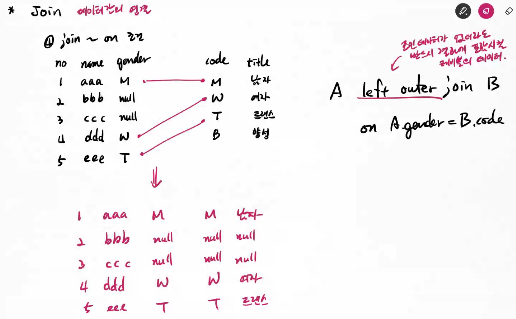| /* 조인 => 서로 관련된 테이블의 데이터를 연결하여 추출하는 방법 => 기법 1) CROSS 조인(=Cartesian product) 2) NATURAL 조인 3) JOIN ~ USING(컬럼명) 4) JOIN ~ ON 5) OUTER JOIN */ -- 4) JOIN ~ ON -- 조인 조건을 on에 명시할 수 있다. select no, title, content, fno, filepath, bno from board5 b join attach_file5 a on b.no=a.bno; -- 조건에 일치하는 경우에만 두 테이블의 데이터를 연결한다. -- 이런 조인을 'inner join' 이라 부른다. -- SQL 문에서도 inner join 이라 기술할 수 있다. -- 물론 inner를 생략할 수도 있다. select no, title, content, fno, filepath, bno from board5 b inner join attach_file5 a on b.no=a.bno; /* [inner] join ~ on 의 문제점 => 반드시 on 에서 지정한 컬럼의 값이 같을 경우에만 두 테이블의 데이터가 연결된다. => 같은 값을 갖는 데이터가 없다면 연결되지 않고, 결과로 출력되지 않는다. => 위 SQL의 실행 결과를 보라! 첨부파일이 없는 2번 게시글은 결과에 포함되지 않는다. */ -- 5) OUTER JOIN -- 조인 조건에 일치하는 데이터가 없더라도 두 테이블 중에서 한 테이블의 데이터를 -- 결과로 포함시키는 명령이다. -- 문법: -- select 컬럼명, 컬럼명, ... -- from 테이블1 t1 [left|right] outer join 테이블2 t2 on t1.컬럼=t2컬럼 -- left outer join => 왼쪽 테이블의 데이터는 반드시 포함시키라는 뜻이다. -- right outer join => 오른쪽 테이블의 데이터를 반드시 포함시키는 뜻이다. -- select no, title, content, fno, filepath, bno from board5 b left outer join attach_file5 a on b.no=a.bno order by no desc; -- 실무 -- 1) 여러 테이블을 조인하여 컬럼을 projection 할 때 -- 각 컬럼이 어떤 테이블의 컬럼인지 명시한다. -- 2) 컬럼을 나열할 때 한 줄에 한 컬럼을 나열한다. select b.no, b.title, b.content, a.fno, a.filepath, a.bno from board5 b left outer join attach_file5 a on b.no=a.bno order by no desc; -- [inner join의 문제점 예1] -- 1) 전체 강의 목록 select lno, titl, rno, mno from lect; -- 2) 전체 강의실 목록 select rno, loc, name from room; -- 3) 강의 정보를 출력할 때 센터 이름과 강의실 이름도 함께 출력해 보자! -- 강의 테이블(lect)에서 강의명을 가져오고, -- 강의실 테이블(room)에서 지점명과 강의실명을 가져오자. select l.lno, l.titl, l.rno, r.rno, r.loc, r.name from lect l inner join room r on l.rno=r.rno; /* inner join의 문제는 위의 경우처럼 강의실이 아직 지정되지 않은 강의의 경우 강의실 테이블의 데이터와 연결하지 못해 결과로 출력되지 않는 문제가 있다. */ -- [inner join의 문제점 예2] -- 1) 모든 강의장 이름을 출력하라. -- 단 강의장에 강의가 배정된 경우 그 강의 이름도 출력하라. -- select r.rno, r.name, r.loc, l.titl from room r inner join lect l on r.rno = l.rno; -- 위의 경우 처럼 만약 기준 컬럼의 값과 일치하는 데이터가 없어서 -- 다른 테이블의 데이터와 연결되지 않았다 하더라도 -- 결과로 뽑아내고 싶다면 outer join을 사용하라! -- 즉 아직 강의실이 배정되지 않은 강의 데이터도 출력하고 싶을 때 -- 출력하고 싶은 테이블을 바깥쪽 테이블로 지정하라! select l.lno, l.titl, r.rno, r.loc, r.name from lect l left outer join room r on l.rno=r.rno; -- 왼쪽 테이블인 lect를 기준으로 room 데이터를 연결한다. -- 만약 lect와 일치하는 데이터가 room에 없더라도 -- lect 데이터를 출력한다! select l.lno, l.titl, r.rno, r.loc, r.name from lect l right outer join room r on l.rno=r.rno; -- 오른쪽 테이블인 room을 기준으로 lect데이터를 연결한다. -- 만약 room과 일치하는 데이터가 lect에 없더라도 -- room 데이터를 출력한다! |