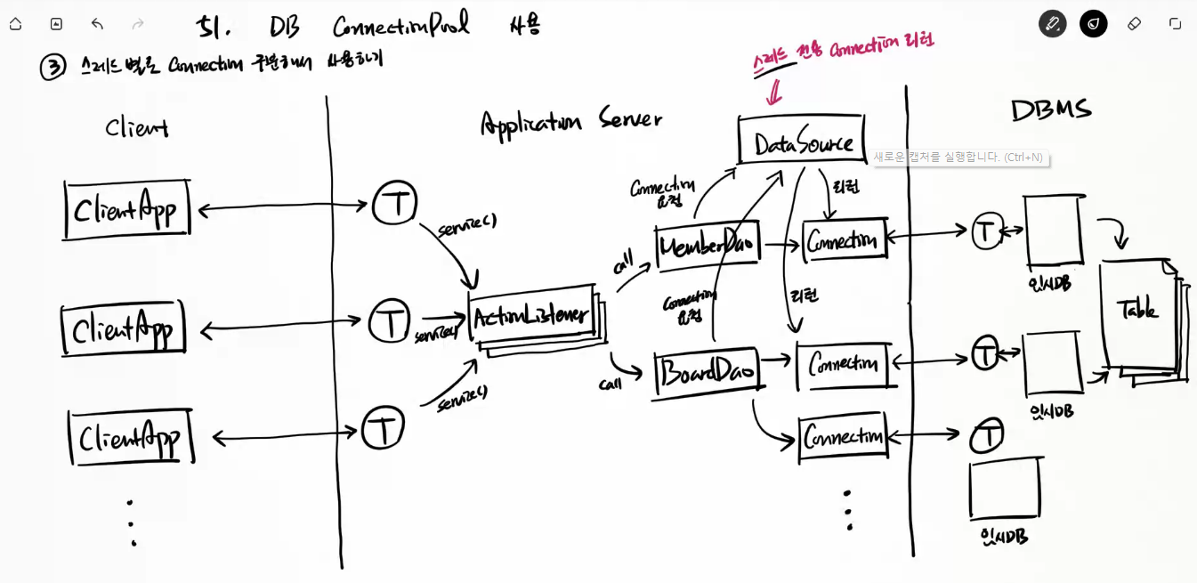 => 스레드 별로(클라이언트 별로) 다른 커넥션을 쓰게 만들어야함.