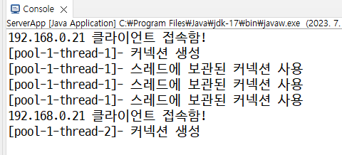 이제 커넥션 나눠져서 클라이언트별 개별 작업수행.