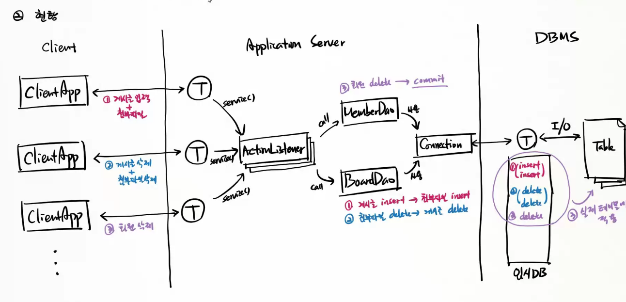 client 3개가 하나의 connection을 공유하고 있기때문에 dbms입장에서는 client 1,2,3을 하나의 클라이언트로 인식.