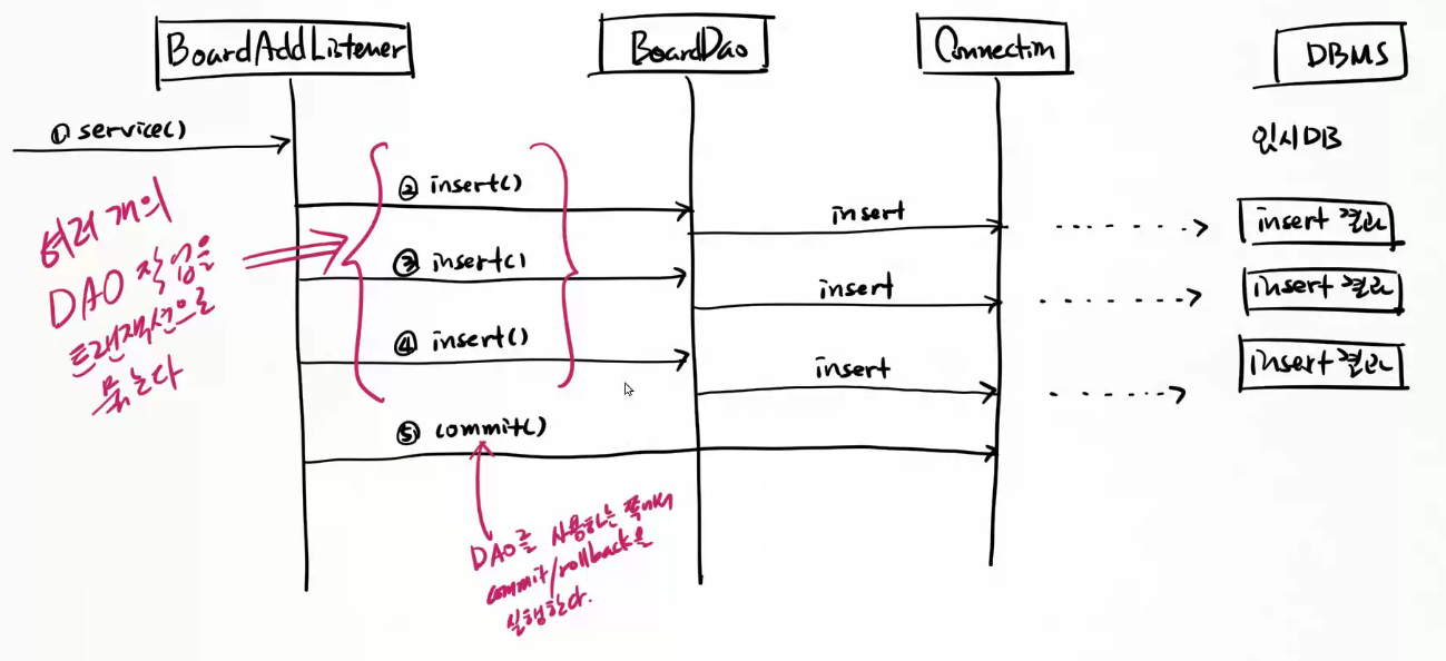 DAO를 사용(호출)하는 쪽에서 commit/rollback을 수행해야한다. (DAO가 아님, DAO에서 하면 임시DB가 아닐 실제 테이블에 적용되는 거임 )