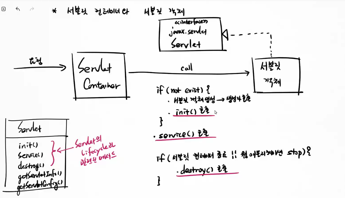 | init() 시작할 때 호출 - 요청이 들어왔을때 실행할 객체가 없을 때 객체 생성할 때 호출됨. // 서블릿 실행에 필요한 자원을 준비하는 코드 |