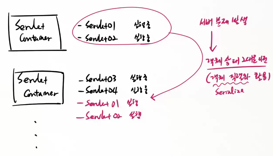 2. 한 서버에 문제가 발생하면 실행중인 서블릿을 다른 서버로 이전하여 사용자에게 문제 되지 않도록 해야한다.