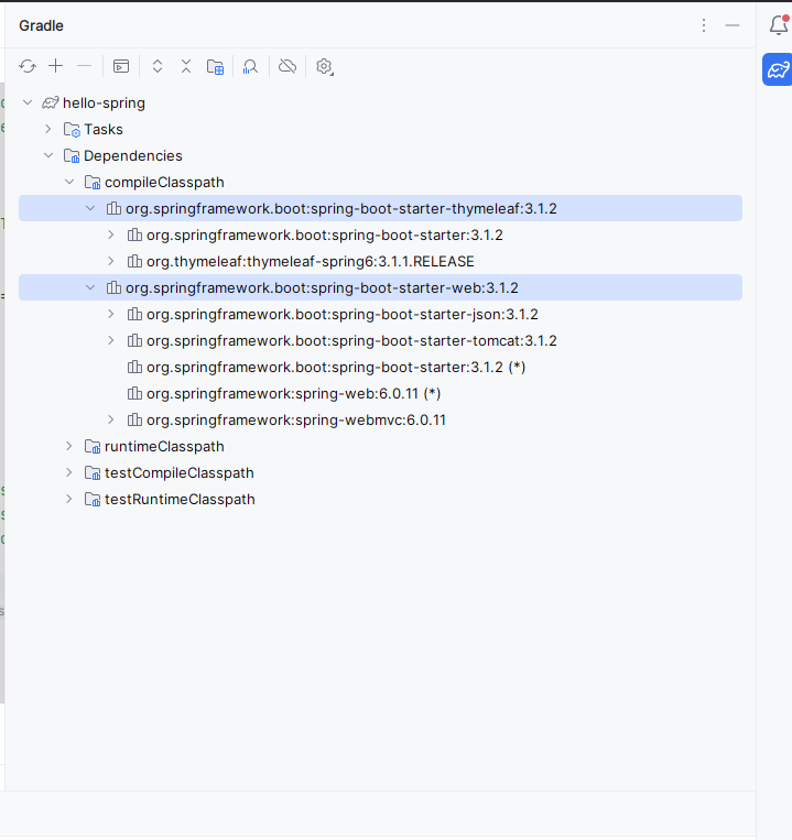 | 스프링 부트 라이브러리 spring-boot-starter-web -spring-boot-starter-tomcat: 톰캣 (웹서버) -spring-webmvc: 스프링 웹 MVC spring-boot-starter-thymeleaf: 타임리프 템플릿 엔진(View) spring-boot-starter(공통): 스프링 부트 + 스프링 코어 + 로깅 -spring-boot --spring-core -spring-boot-starter-logging --logback, slf4j |