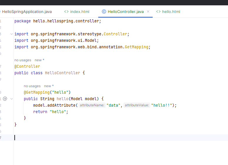 GetMapping("hello")의 hello가 get 방식으로 넘어오면 hello url에 매칭됨