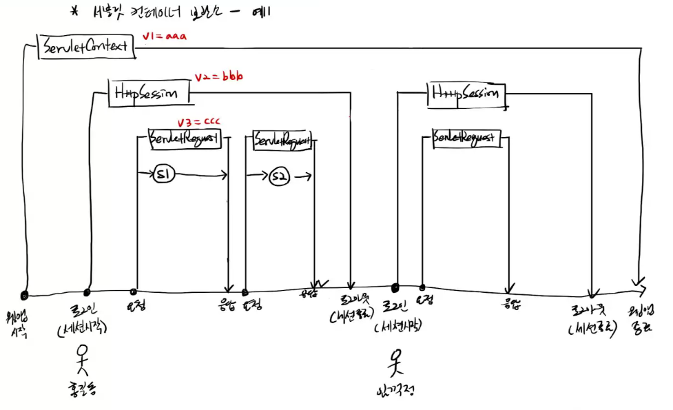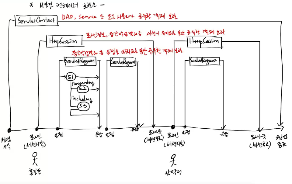 웹앱 시작하면 servlet context 한 개가 생성됨. app 마다 한 개씩 있는 거임, 앱이 종료되면 사라짐