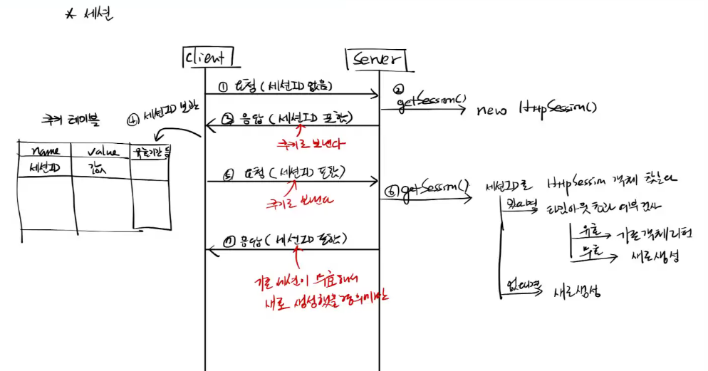 세션 id는 쿠키로 주고 받음. 타임아웃 되면 새로 생성함.