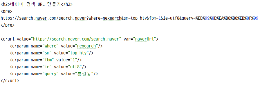 | <c:if test="${param.search == 'naver'}"> <c:redirect url="http://www.naver.com"/> <%-- response.sendRedirect("http://www.naver.com"); --%> </c:if> <c:if test="${param.search == 'daum'}"> <c:redirect url="http://www.daum.net"/> </c:if> <p>search 라는 이름으로 검색 엔진을 지정하세요!<br> 유효한 엔진은 'naver', 'daum' 입니다.</p> |