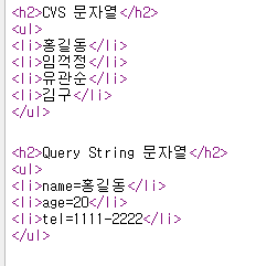 | <h2>Query String 문자열</h2> <% pageContext.setAttribute("qs", "name=홍길동&age=20&tel=1111-2222"); %> <ul> <c:forTokens items="${pageScope.qs}" var="n" delims="&"> <li>${n}</li> </c:forTokens> </ul> |