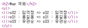 | <h2>Map 객체</h2> <% Map<String,Object> names3 = new HashMap<>(); names3.put("s01", "홍길동"); names3.put("s02", "임꺽정"); names3.put("s03", "유관순"); pageContext.setAttribute("names3", names3); %> <ul> <%-- Map 객체에 대해 반복문을 돌리면 var로 저장되는 것은 key와 value를 갖고 있는 Entry 객체이다. --%> <c:forEach items="${names3}" var="n"> <li>${n.getKey()} : ${n.getValue()} => ${n.key} : ${n.value}</li> </c:forEach> </ul> |