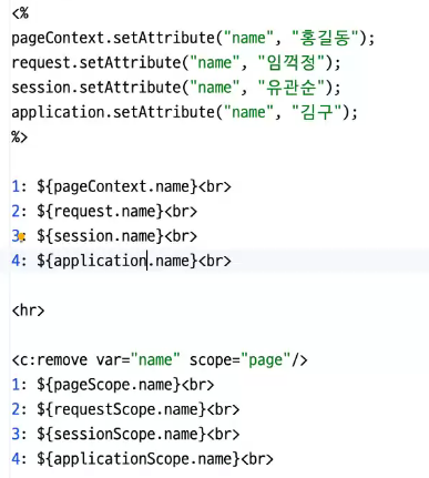 --%> <c:set var="name3">유관순</c:set> 1: ${requestScope.name3}<br> 2: ${pageScope.name3}<br> 3: ${name3}<br> |