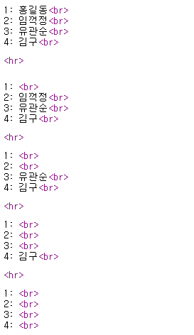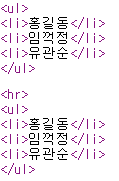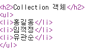 pageContext.setAttribute("names", new String[]{"홍길동", "임꺽정", "유관순"}); %> <hr> <ul> <% String[] names = (String[]) pageContext.getAttribute("names"); for (String n : names) {%> <li><%=n%></li> <%} %> </ul> <hr> <ul> <c:forEach items="${names}" var="n"> <li>${n}</li> </c:forEach> </ul> |