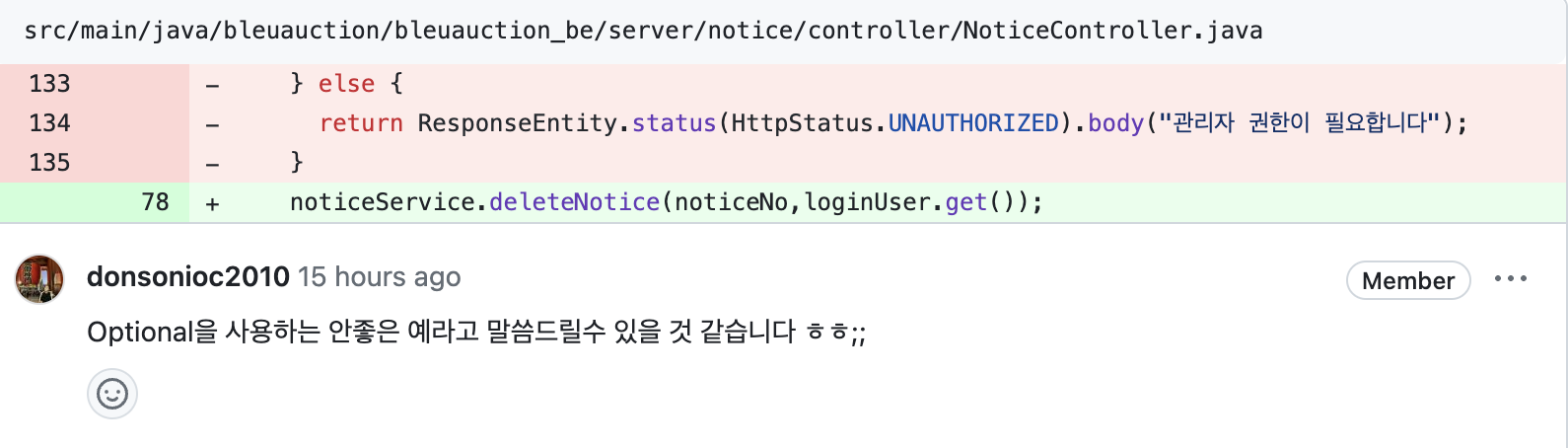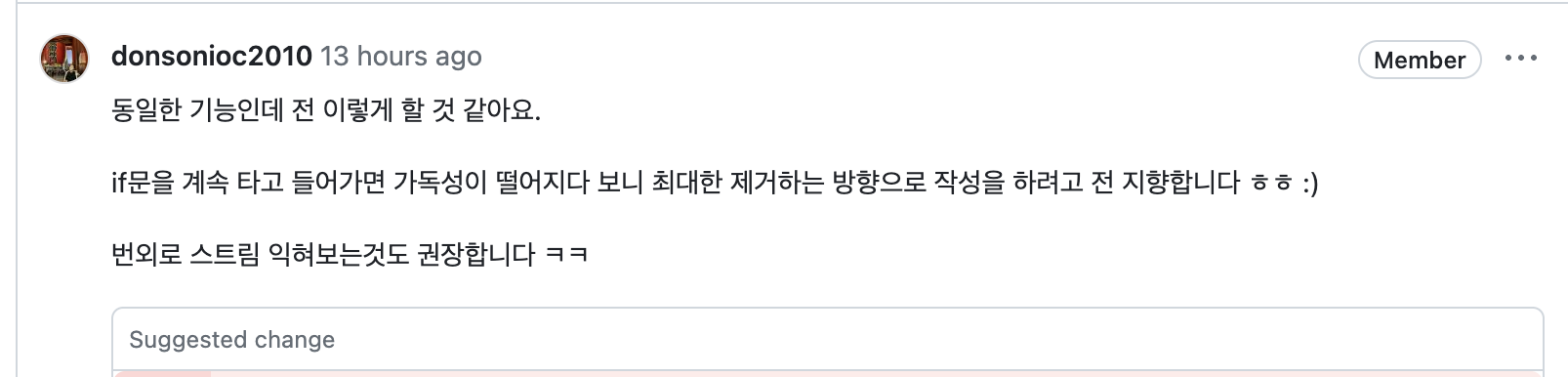 새벽에 몰래 작업해서 pr을 날렸는데 감동스럽게도 종1님이 코드를 싹 훑고 코멘트를 다 달아줬다.
