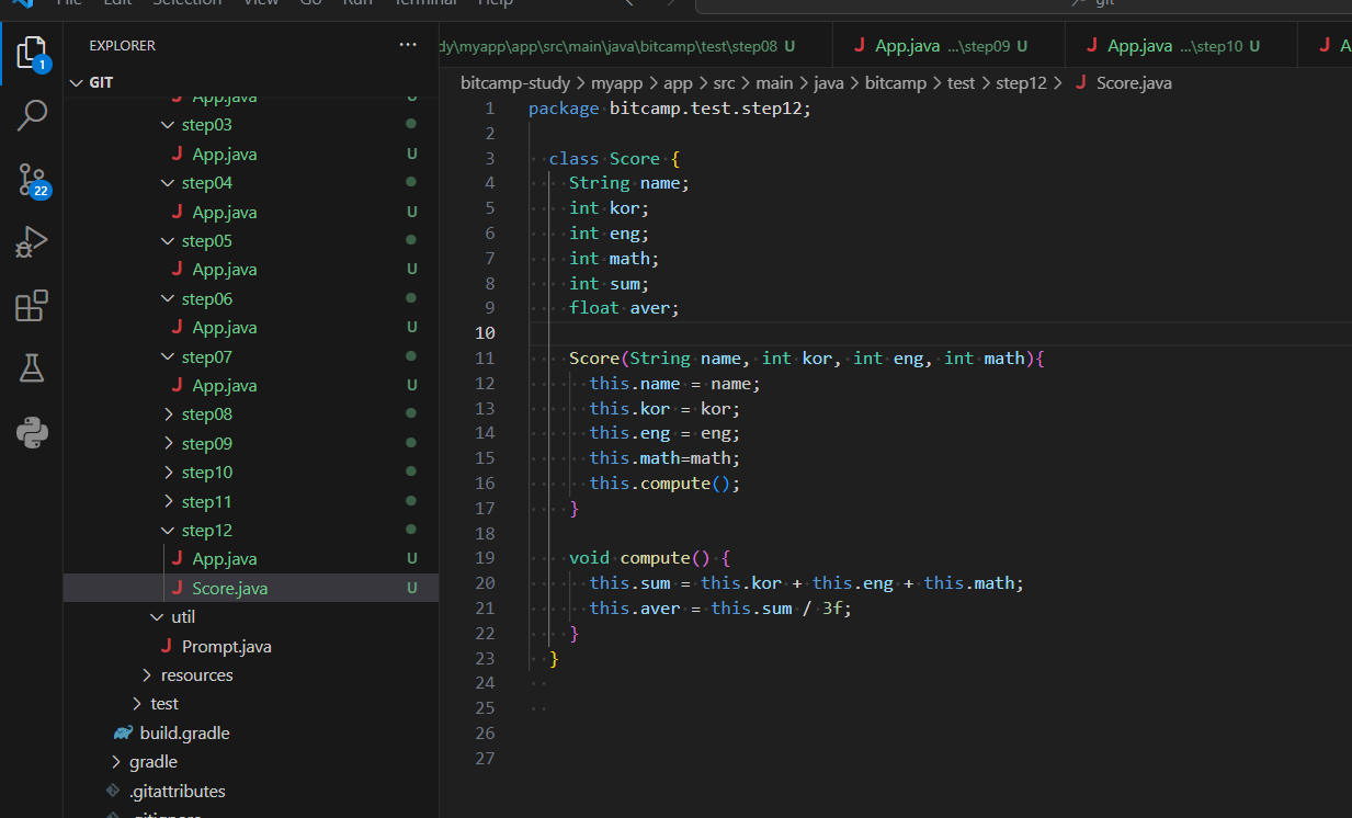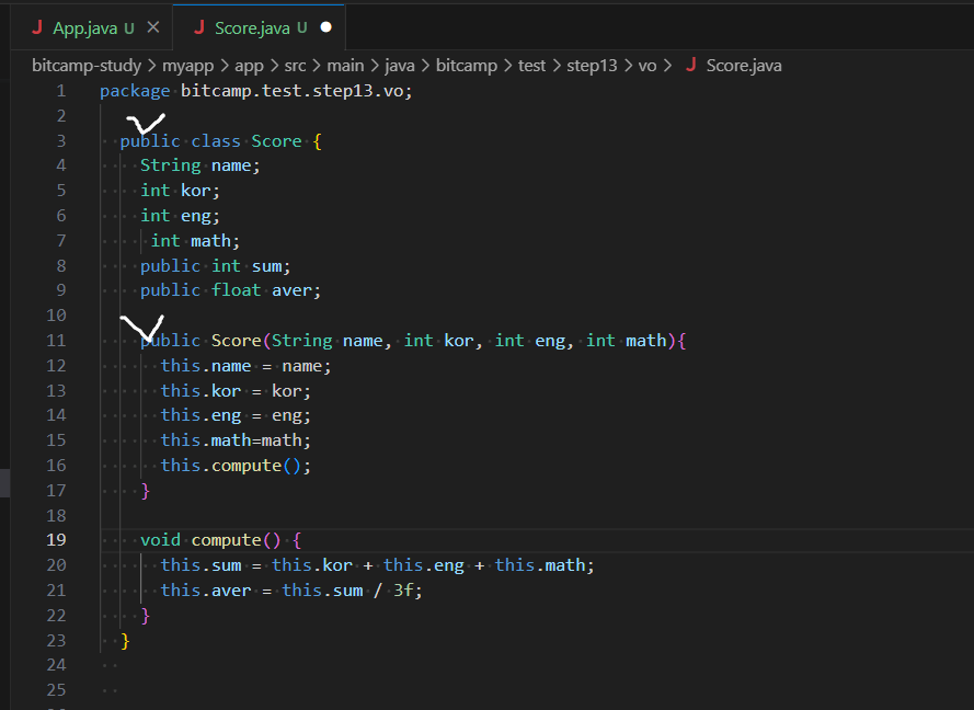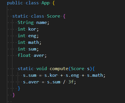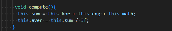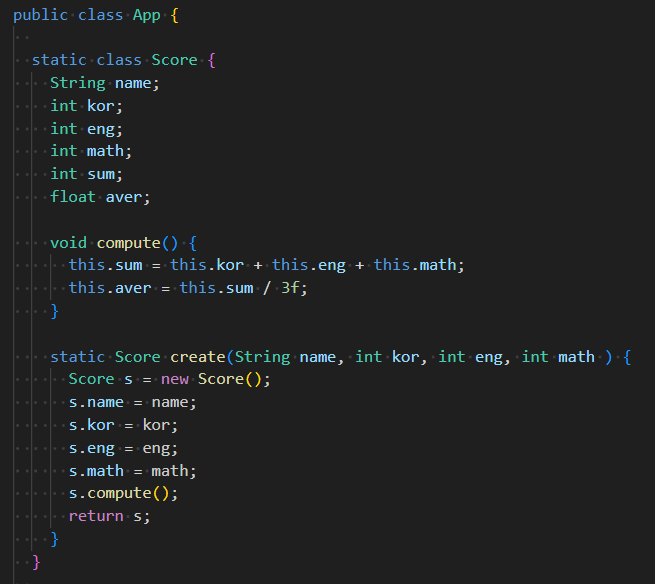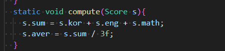 compute는 성적을 다루는 메서드이기 때문에 메인이나 App에 두는 게 아니라 관련 메서드인 Score에 갖다둔다.
