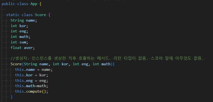 생성자: 인스턴스를 생상한 직후 호출하는 메서드. 리턴 타입이 없음. 스코어 앞에 아무것도 없음. 클래스랑 이름 똑같아야함